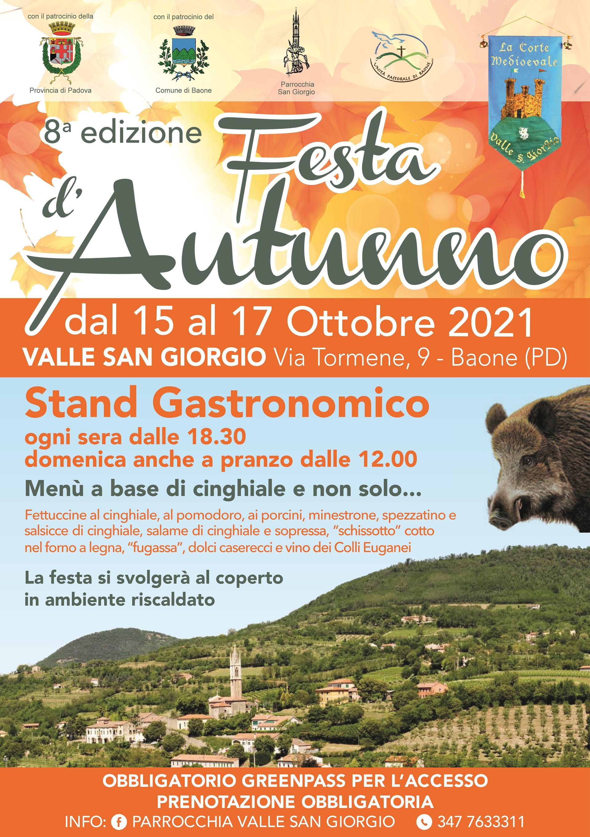 Dal 15 al 17 ottobre, la Parrocchia di Valle San Giorgio in collaborazione con l’Associazione La Corte Medioevale e con il patrocinio della Provincia di Padova, organizza l'8^ edizione della Festa d’Autunno, a Valle San Giorgio (Baone).