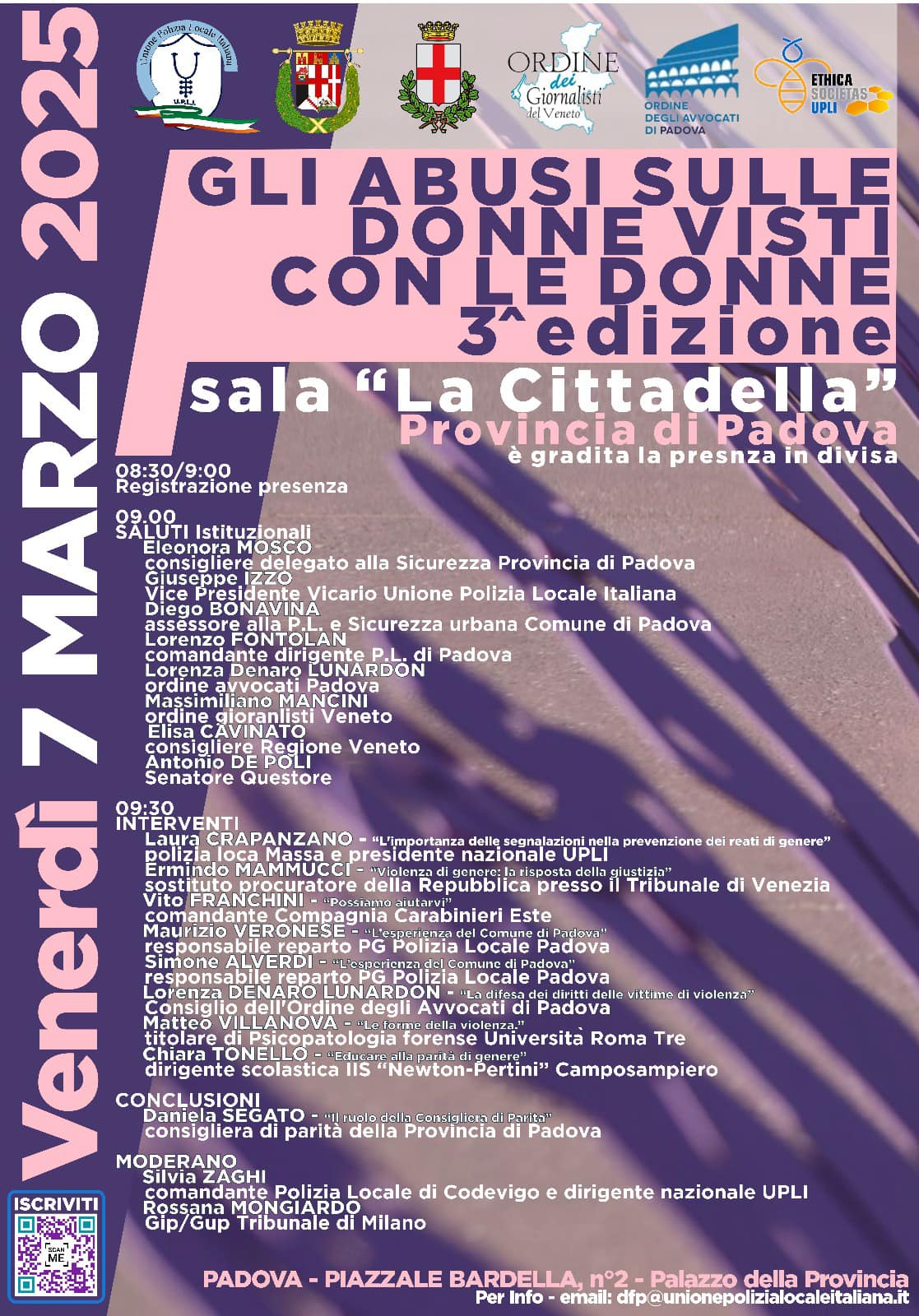 La Provincia di Padova ospita la 3° edizione del convegno promosso da UPLI (Unione Polizia Locale Italiana) che affronta la violenza di genere, quest'anno con il titolo "Gli Abusi sulle donne visti con le donne". Il Convegno, patrocinato da Provincia e Comune di Padova e accreditato con l'Ordine dei giornalisti del Veneto e l'Ordine degli avvocati di Padova, si tiene venerdì 7 marzo 2025 nella sala "La Cittadella", presso la 3° torre, sede della Provincia di Padova, in piazza Bardella 2.